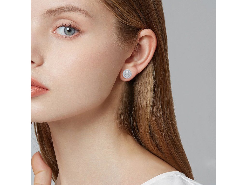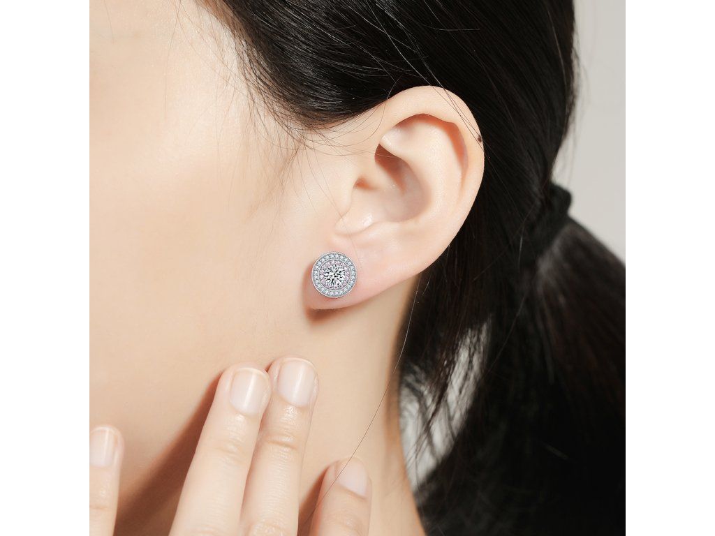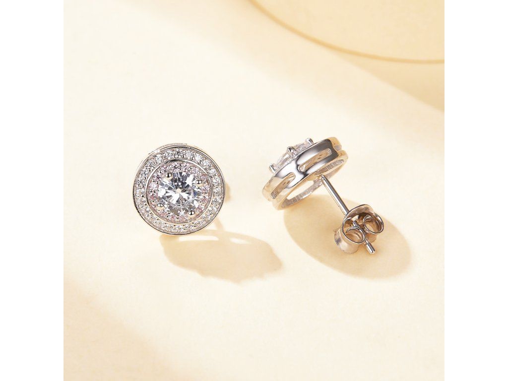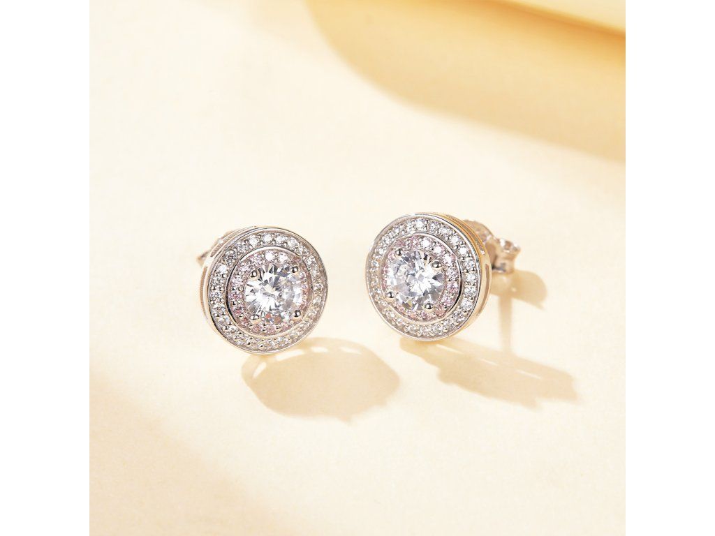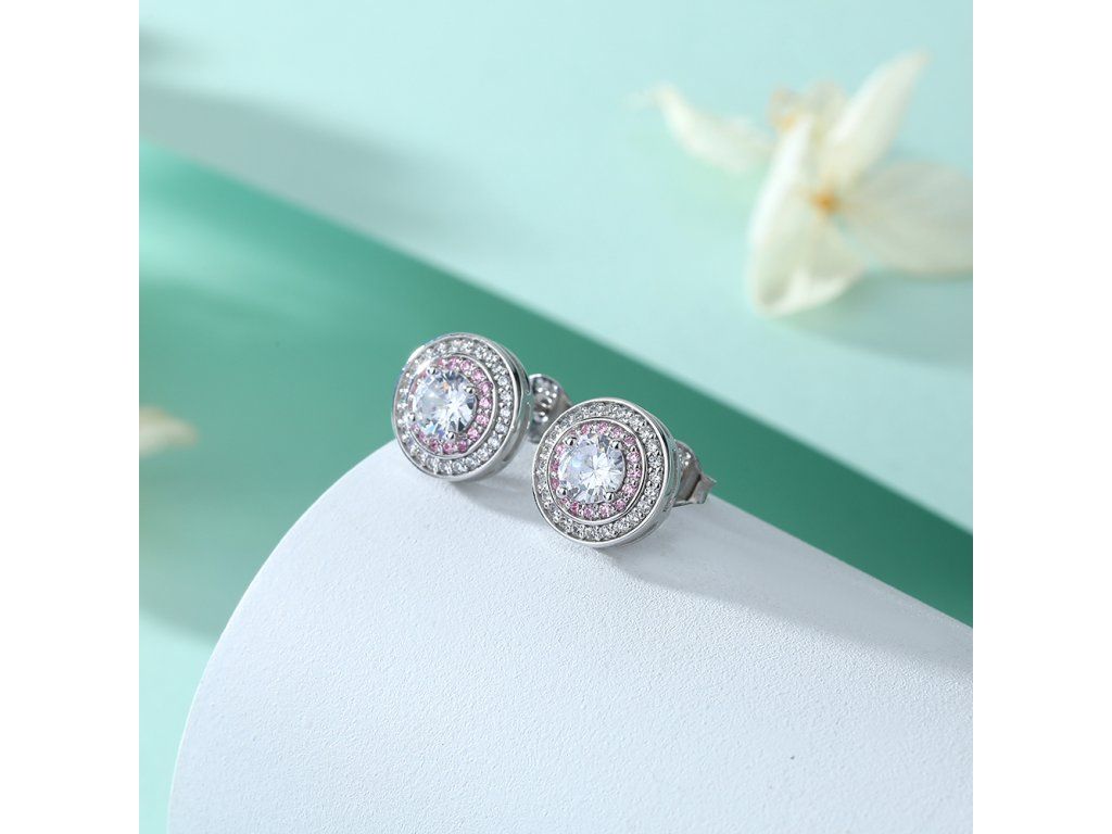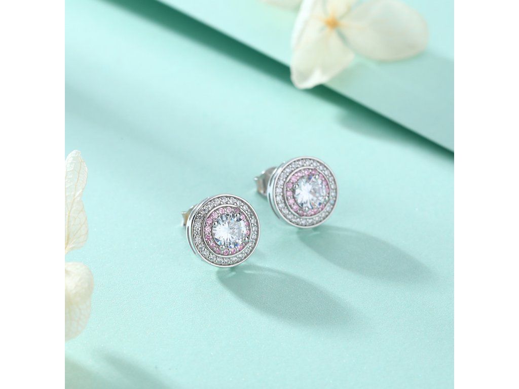 Luxusní puzetové náušnice o průměru 1 cm z nejkvalitnějšího stříbra ryzosti 925/1000 potažené velkou vrstvou rhodia. Ozdobou náušnice je dominantní zirkon, kolem kterého je kolečko růžových zirkonů, které obklopuje další kolečko čirých zirkonů nejvyšší kvality 5A.